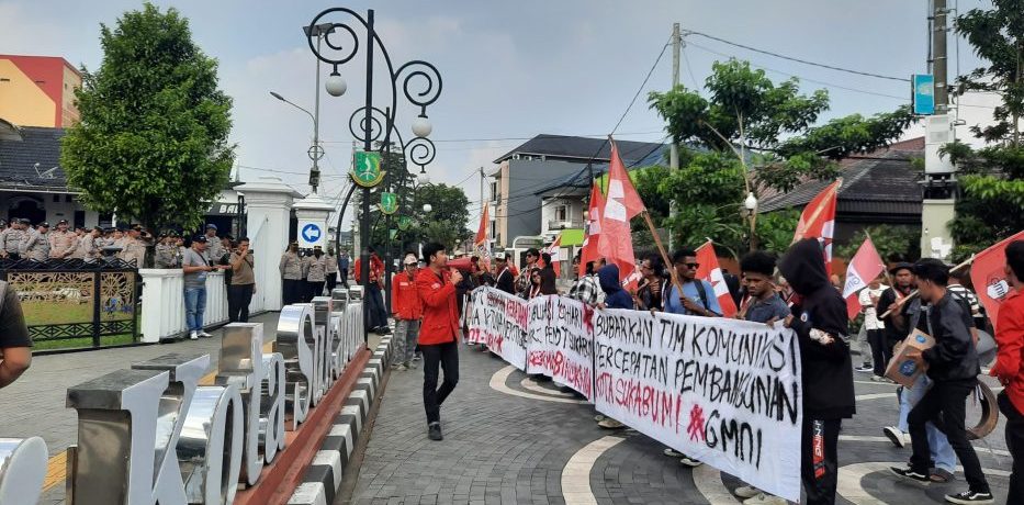 LINGKARPENA.ID | Puluhan mahasiswa yang tergabung dalam Gerakan Mahasiswa Nasionalis Indonesia (GMNI) Dewan Pengurus Cabang (DPC) Sukabumi Raya menggelar aksi demonstrasi di depan Balai Kota Sukabumi, Rabu, (04/06/2025).