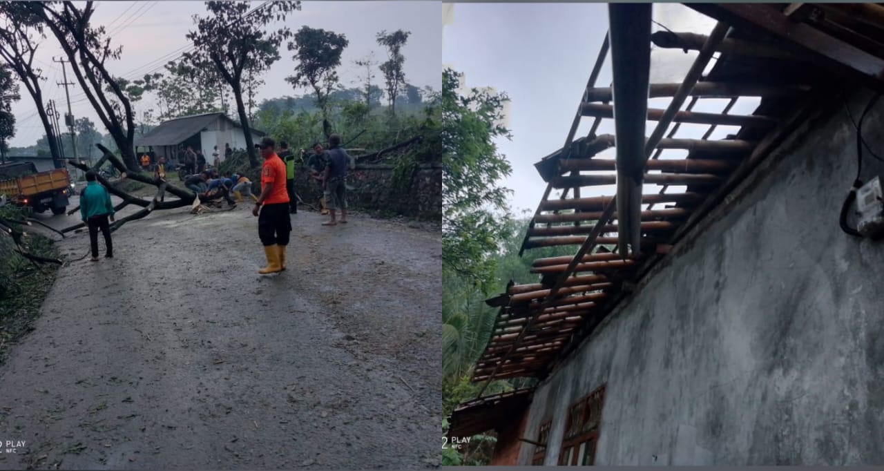 Peristiwa tersebut menyebabkan puluhan rumah rusak, fasilitas umum terdampak, serta sejumlah pohon tumbang yang sempat menutup akses jalan kabupaten dan provinsi di beberapa titik.