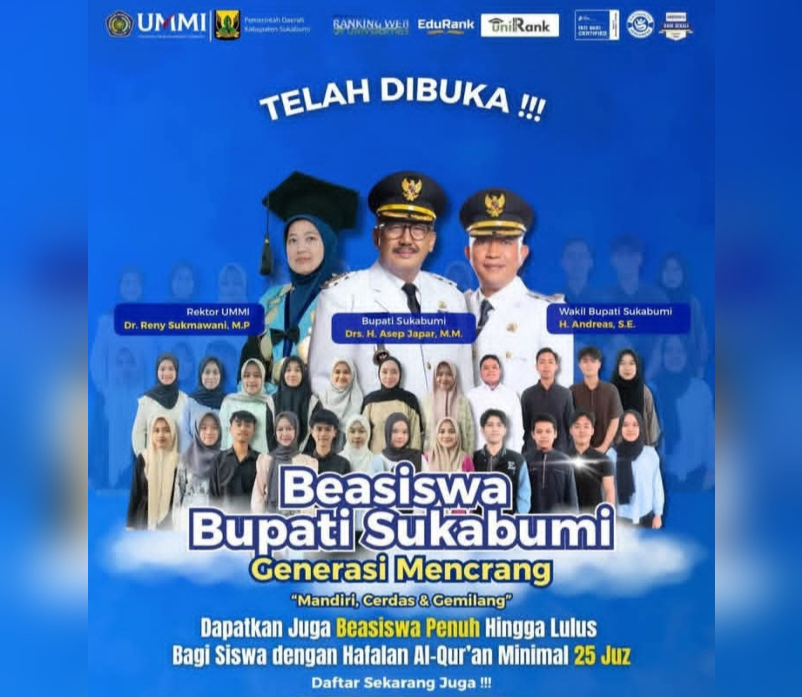 Program ini turut didukung oleh Pemerintah Daerah Kabupaten Sukabumi serta Universitas Muhammadiyah Sukabumi (UMMI). Dalam publikasi tersebut, turut ditampilkan sejumlah tokoh, di antaranya Bupati Sukabumi Drs. H. Asep Japar, M.M., Wakil Bupati Sukabumi H. Andreas, S.E., serta Rektor UMMI Dr. Reny Sukmawani, M.P. sebagai bentuk dukungan terhadap peningkatan kualitas sumber daya manusia di daerah.