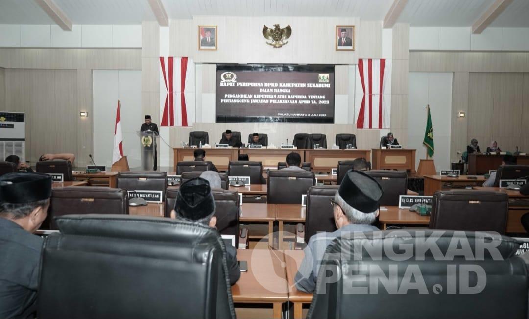Setelah mendengarkan pendapat akhir dari Bupati Sukabumi dalam rapat paripurna yang berlangsung, Selasa, (2/7/2024) di ruang rapat gedung DPRD jalan komplek perkantoran Jajaway, Palabuhanratu bersama sama sepakati Raperda menjadi Perda pelaksanaan anggaran tahun 2023 resmi disahkan.