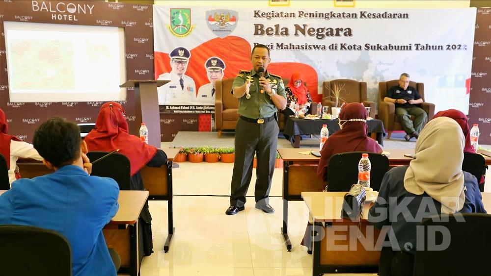 Dandim 0607 Kota Sukabumi, Letkol Inf Dedy Ariyanto saat memberikan wawasan kebangsaan dan Bela Negara pada Seminar Mahasiswa, di Ballroom Balcony, Jalan Selabintana, Kecamatan Cikole, Kota Sukabumi, Kamis (27/10 /2022). | Foto: Istimewa