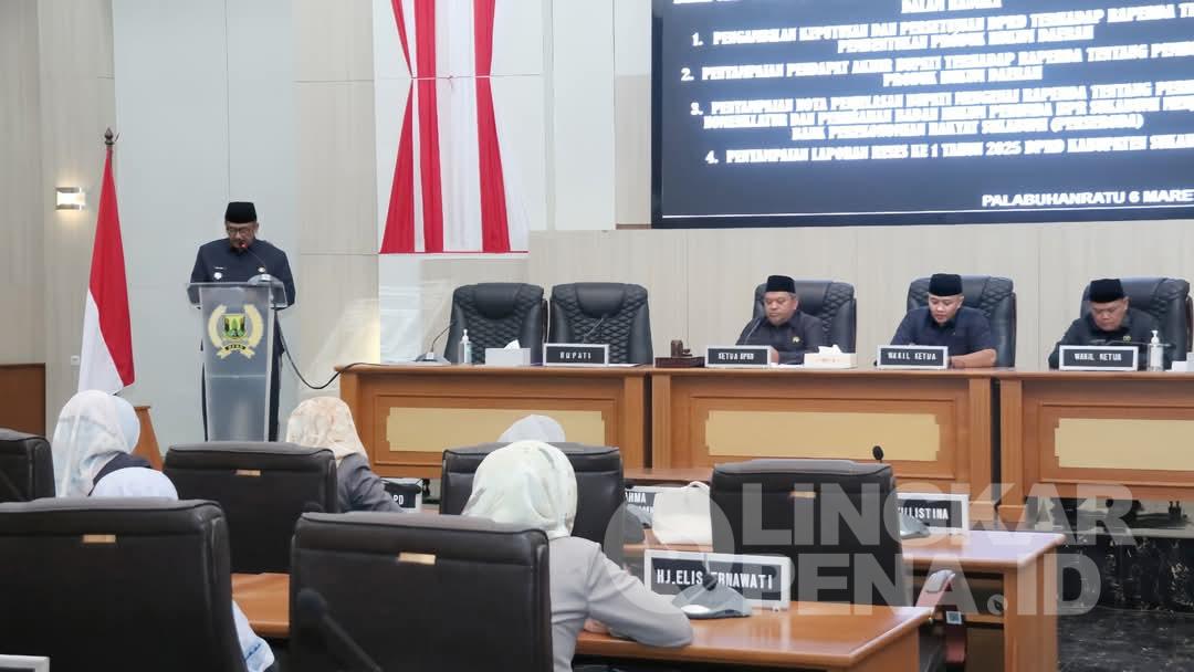 LINGKARPENA.ID | Dewan Perwakilan Rakyat Daerah (DPRD) Kabupaten Sukabumi menggelar Rapat Paripurna dengan agenda penyampaian Keputusan DPRD terhadap Hasil Penyempurnaan Rancangan Peraturan Daerah (Raperda) tentang Produk Hukum Daerah serta penyampaian laporan reses pertama tahun 2025. Rapar berlangsung di ruang Rapat Paripurna DPRD Kabupaten Sukabumi, Kamis (6/3/2025).