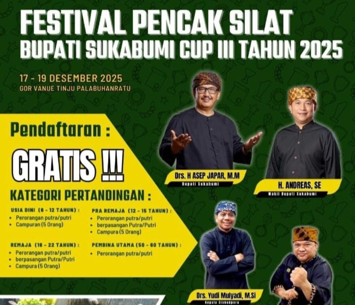 LINGKARPENA.ID | Festival Pencak Silat Bupati Sukabumi Cup III Tahun 2025 dijadwalkan berlangsung pada 17–19 Desember 2025 di Gedung Olahraga (GOR) Venue Tinju Palabuhanratu, Kabupaten Sukabumi. Ajang bergengsi ini kembali digelar sebagai wadah pengembangan atlet serta pelestarian budaya pencak silat di Kabupaten Sukabumi.