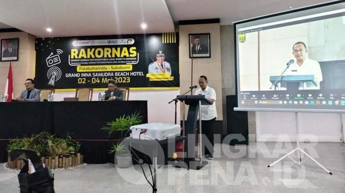 LINGKARPENA.ID | Kepala Dinas Kominfosan Kabupaten Sukabumi Eka Nandang Nugraha membuka Rapat Kerja Nasional (Rakornas) Asosiasi Lembaga Penyiaran Publik Lokal (LPPL) Radio TV Indonesia, di Aula Grand Inna Samudera Beach Hotel Palabuhanratu, Rabu (03/5/23).