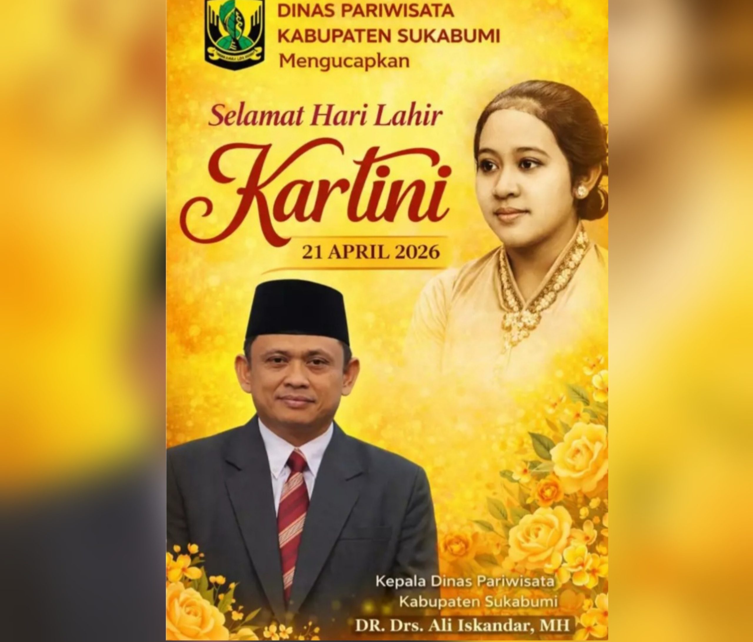 LINGKARPENA.ID | Nuansa keemasan yang hangat seolah memantulkan semangat emansipasi perempuan dalam peringatan Hari Kartini tahun ini. Di tengah momentum 21 April 2026, Kepala Dinas Pariwisata Kabupaten Sukabumi, Dr..Drs. Ali Iskandar, MH, menyampaikan ucapan selamat Hari Kartini sekaligus mengajak masyarakat untuk terus meneladani nilai perjuangan R.A. Kartini dalam kehidupan sehari-hari.