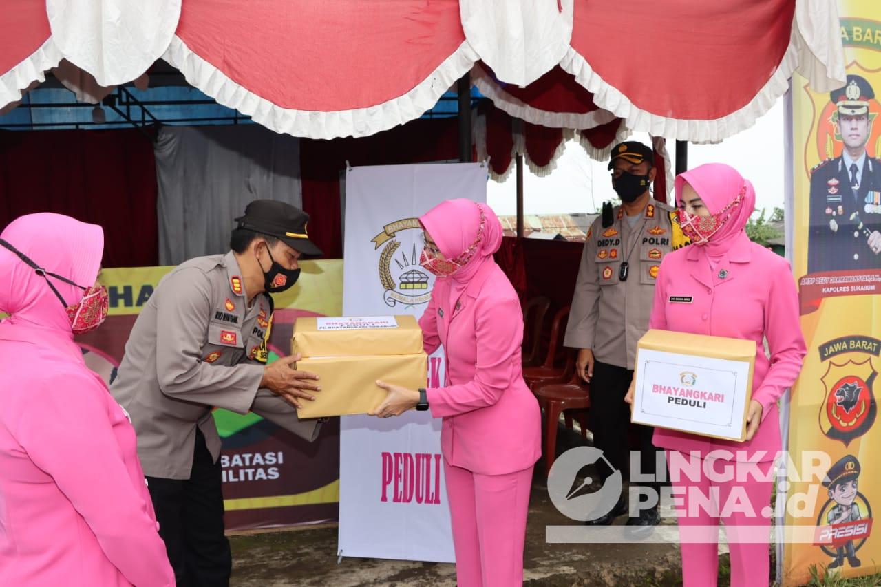 Kapolres Sukabumi menyerahkan bingkisan yang diberikan oleh Ketua Bhayangkari Cabang Sukabumi, Ny Hesti Dedy yang didampingi anggota Bhayangkari lainnya. Bingkisan tersebut diterima langsung oleh para anggota yang bertugas di Pos pam, Pos yan dan Pos gatur yang berada di jalur utara Kabupaten Sukabumi.