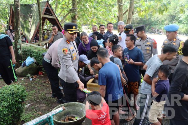 LINGKARPENA.ID |Kapolres Sukabumi Kota, AKBP Ari Setyawan Wibowo memborong dagangan yang dijajakan pedagang eskrim keliling saat memantau kawasan wisata pemandian Cikundul Lembursitu Kota Sukabumi, Selasa (25/4/2023) siang.