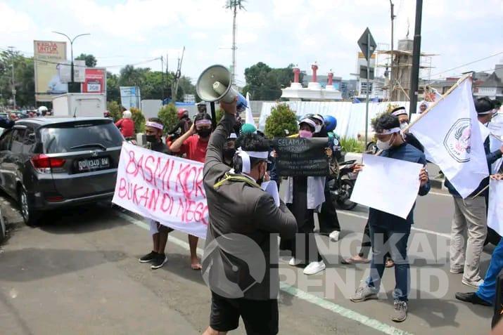 Aliansi Masyarakat Lawan Korupsi (ALMK) saat menggelar aksi meminta Kajari Kota Sukabumi mengusut tuntas kasus dugaan tindak pidana korupsi (Tipikor) Bawaslu anggaran tahun 2019.| Foto: Istimewa