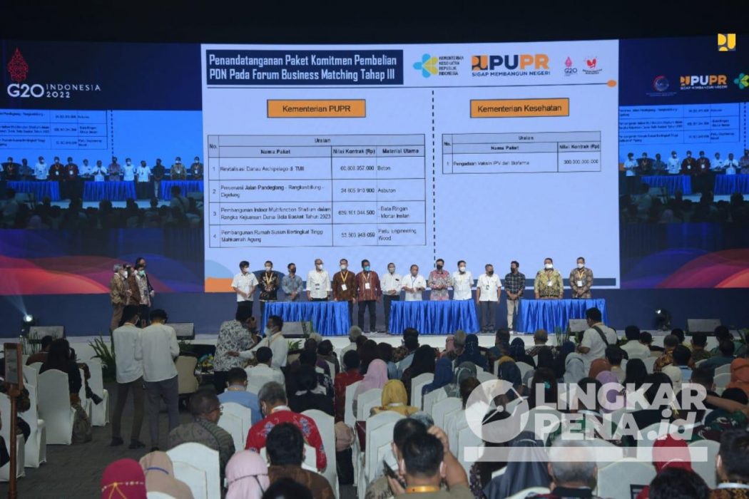 LINGKARPENA.ID – Forum Business Matching (Temu Bisnis) Tahap III menghasilkan kesepakatan lima paket komitmen pembelian PDN, yakni empat paket senilai Rp778 miliar untuk pekerjaan di Kementerian Pekerjaan Umum dan Perumahan Rakyat (PUPR) dan satu paket senilai Rp300 miliar di Kementerian Kesehatan.