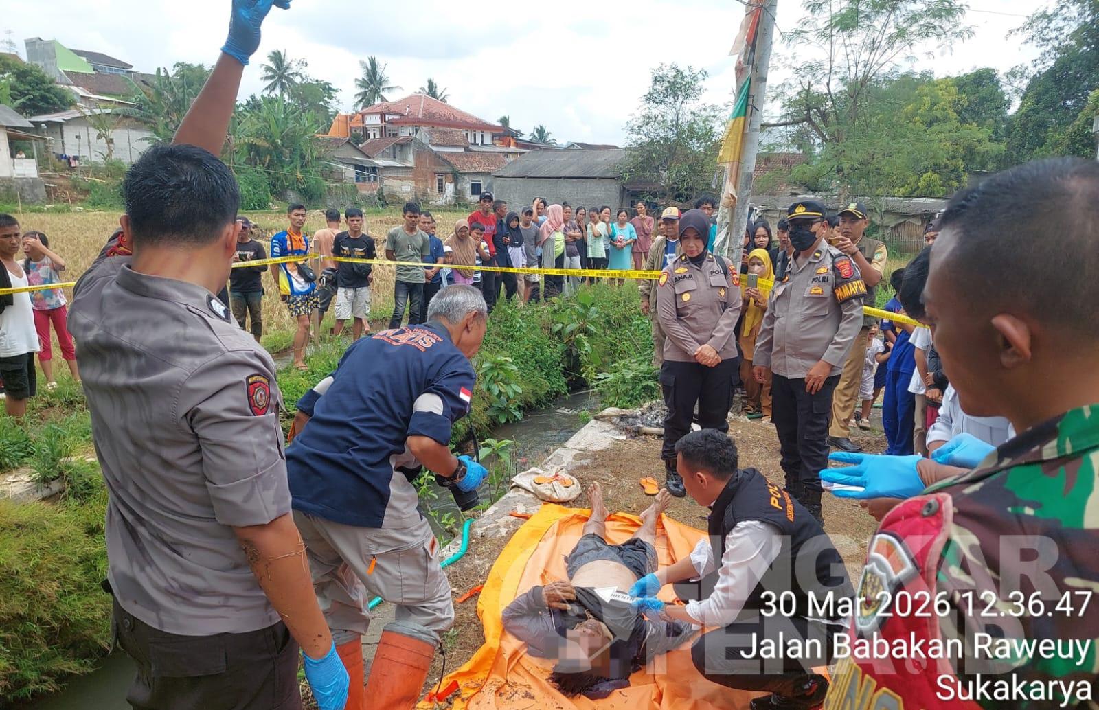 LINGKARPENA.ID | Warga Perumahan Cemerlang Indah Residence, Kelurahan Sukakarya, Kecamatan Warudoyong, Kota Sukabumi, digegerkan dengan penemuan sesosok mayat laki-laki di aliran sungai, Senin (30/3/2026) sekitar pukul 11.30 WIB.