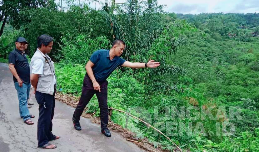 LINGKARPENA.ID | Ketua Komisi IV DPRD Kabupaten Sukabumi, H. Hera Iskandar meninjau lokasi tanah longsor di Kampung Kadupugur Desa Sukadamai, Kecamatan Cicantayan, Kabupaten Sukabumi, Rabu (01/03/2023).