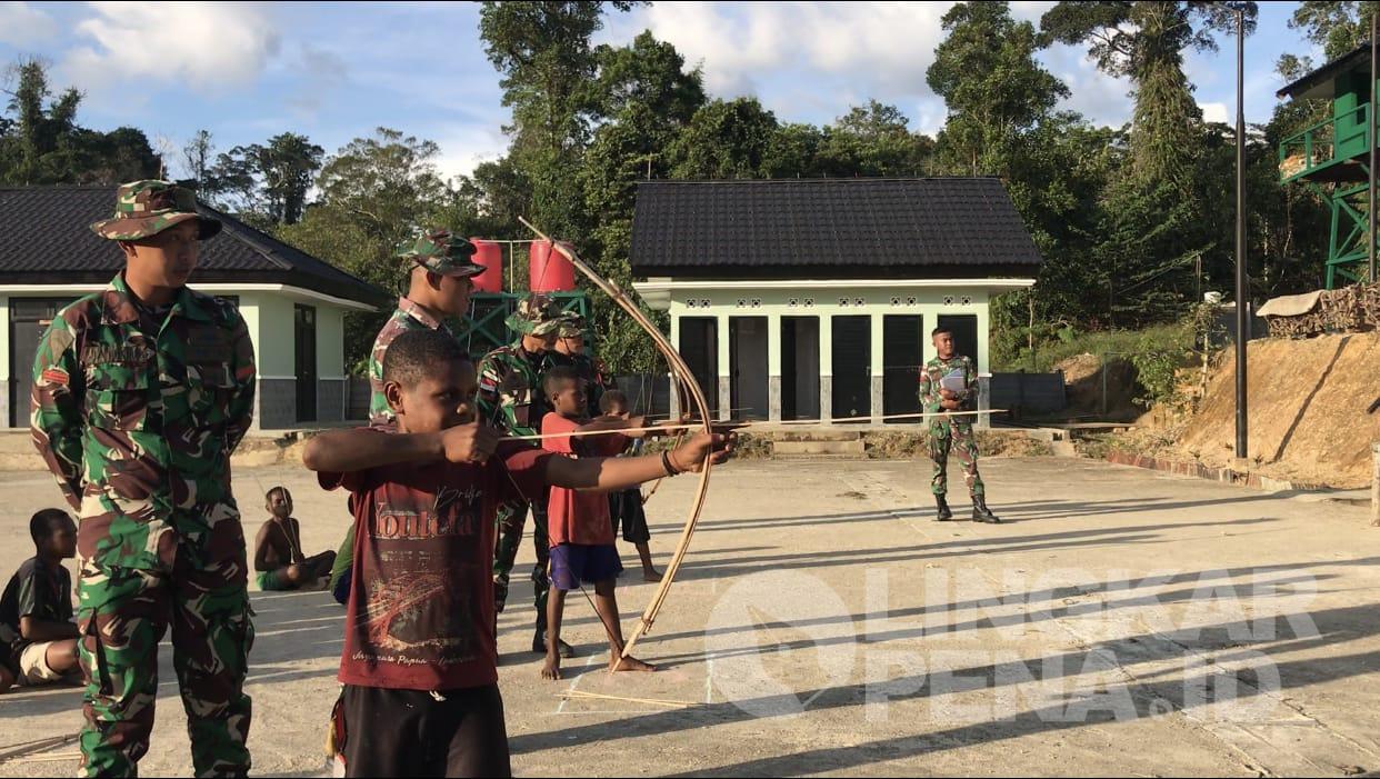 LINGKARPENA.ID | Mengisi liburan sekolah dengan hal-hal yang bermanfaat, Pos Somografi Satgas Yonif 310/KK adakan lomba Jubi (panahan) untuk anak-anak di perbatasan RI-PNG di Kampung Somografi, Distrik Web, Kabupaten Keerom, Papua, Minggu (30/6/2024).