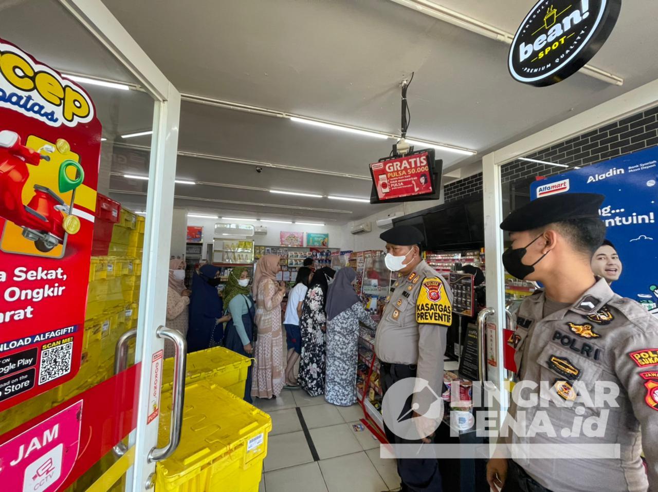 Polisi kemudian memasuki minimarket yang sedang ramai dikunjungi pengunjung. Saat itu di lokasi sedang terjadi antrian pembeli minyak goreng yang di jual di minimarket tersebut sedang berlangsung.