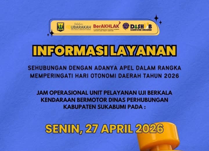 LINGKARPENA.ID | Dinas Perhubungan Kabupaten Sukabumi mengumumkan adanya penyesuaian jam operasional layanan uji berkala kendaraan bermotor pada Senin, 27 April 2026. Perubahan ini dilakukan sehubungan dengan pelaksanaan apel dalam rangka memperingati Hari Otonomi Daerah tahun 2026 yang diikuti oleh jajaran perangkat daerah.