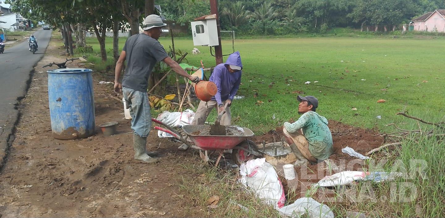 Dadang, pelaksana lapangan yang ditemui Lingkarpena.id, menjelaskan bahwa pekerjaan saat ini tengah fokus pada pemasangan angkur atau dudukan tiang lampu yang dicor menggunakan beton.