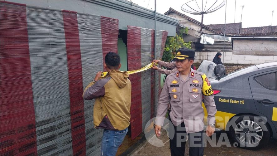 Polisi saat memasang garis Polis Line di tempat kejadian perkara terbunuhnya sang Paman di tangan Ponakan di Cibadak.| Istimewa