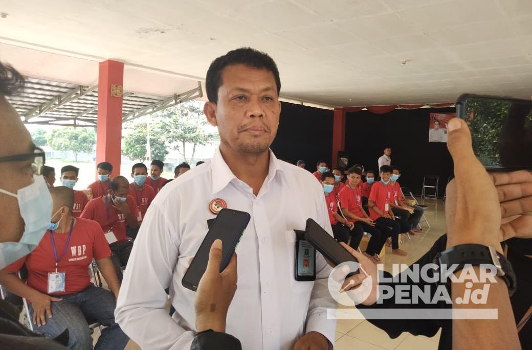 Kepala Lembaga Pemasyarakatan Lapas kelas IIB Waarungkiara, Ahmad Tohari, saat memberikan keterangan pers usai penutupan program rehabilitasi sosial narkoba warga binaan tahun anggaran 2022 di Aula Gazebo Lapas Warungkiara, Selasa (3/8/22).| Foto: Ahmad Zazuli