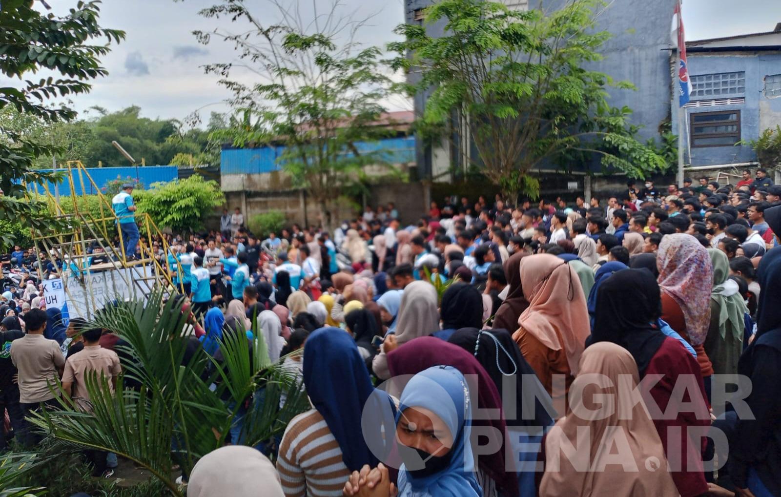 LINGKARPENA.ID | Ribuan buruh PT Muara Tunggal menggelar aksi demonstrasi di depan pintu gerbang pabrik yang berada di Jalan Perintis Kemerdekaan No. 126, Kecamatan Cibadak, Kabupaten Sukabumi, Rabu (18/2/2026). Aksi tersebut dilakukan sebagai bentuk protes terhadap kebijakan perusahaan yang diduga akan membayarkan Tunjangan Hari Raya (THR) tidak secara penuh.
