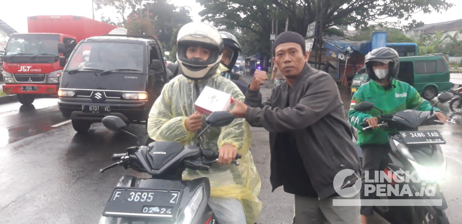 Koordinator Poskab Sapujagat Kota Sukabumi, Ustadz Junaedi Muslim saat membagikan Takjil kepada pengendara sepeda motor yang melintas di Jalan Jalur Lingkar Selatan, Ahad (24/4/22).| Foto: Azis Ramdhani