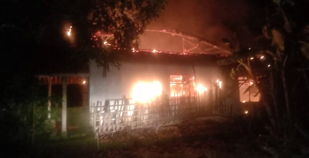 FOTO: Rumah Dede Suhendar, warga Desa Jagamukti, Kecamatan Surade Kabupaten Sukabumi saat terbakar pada Minggu malam (23/3). Api berkobar hebat sebelum dipadamkan.| Istimewa