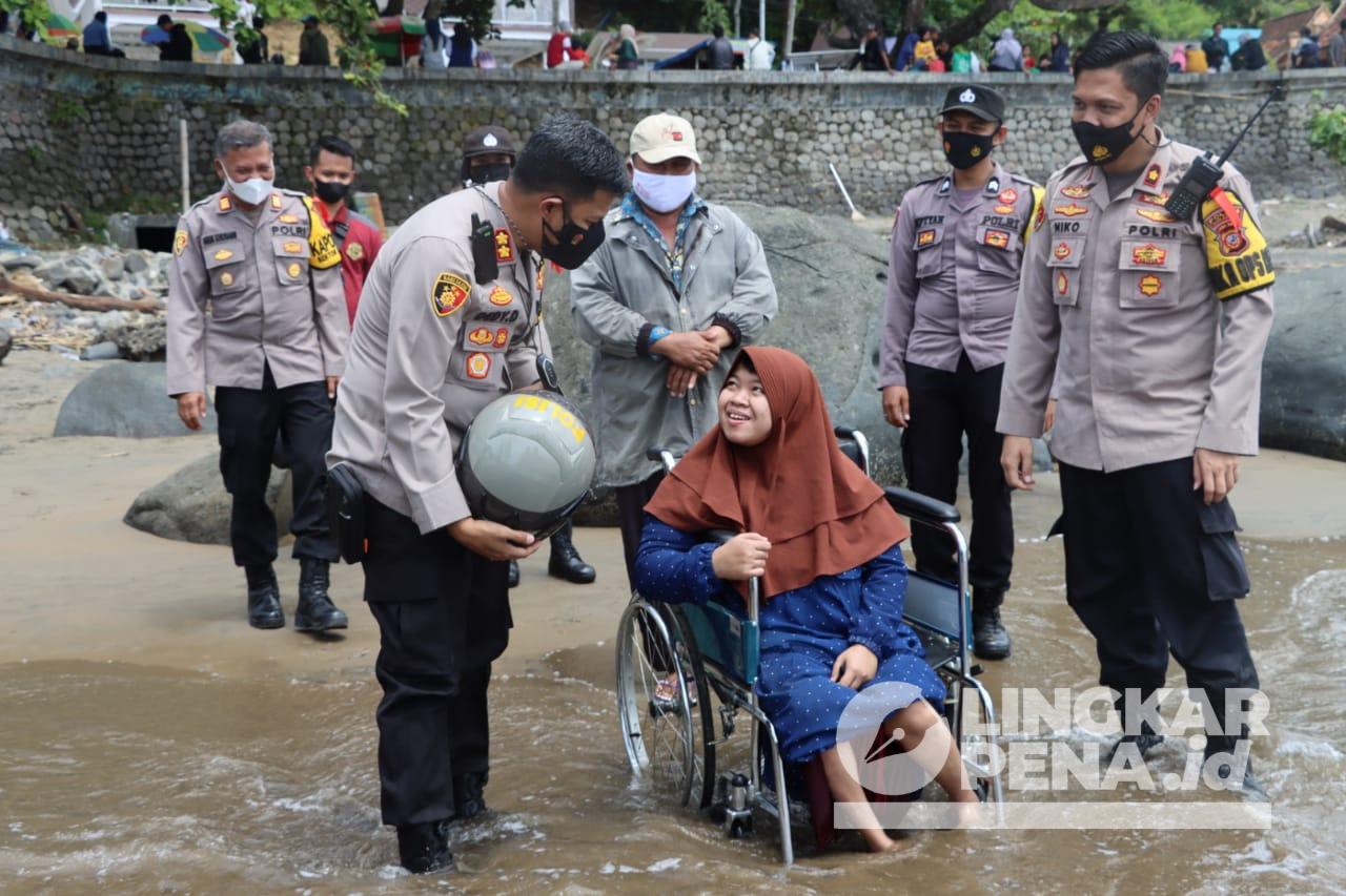 Saat kegiatan berlangsung, Kapolres langsung menemui warga disabilitas yang bertahun-tahun tidak bisa melihat pantai secara langsung itu.