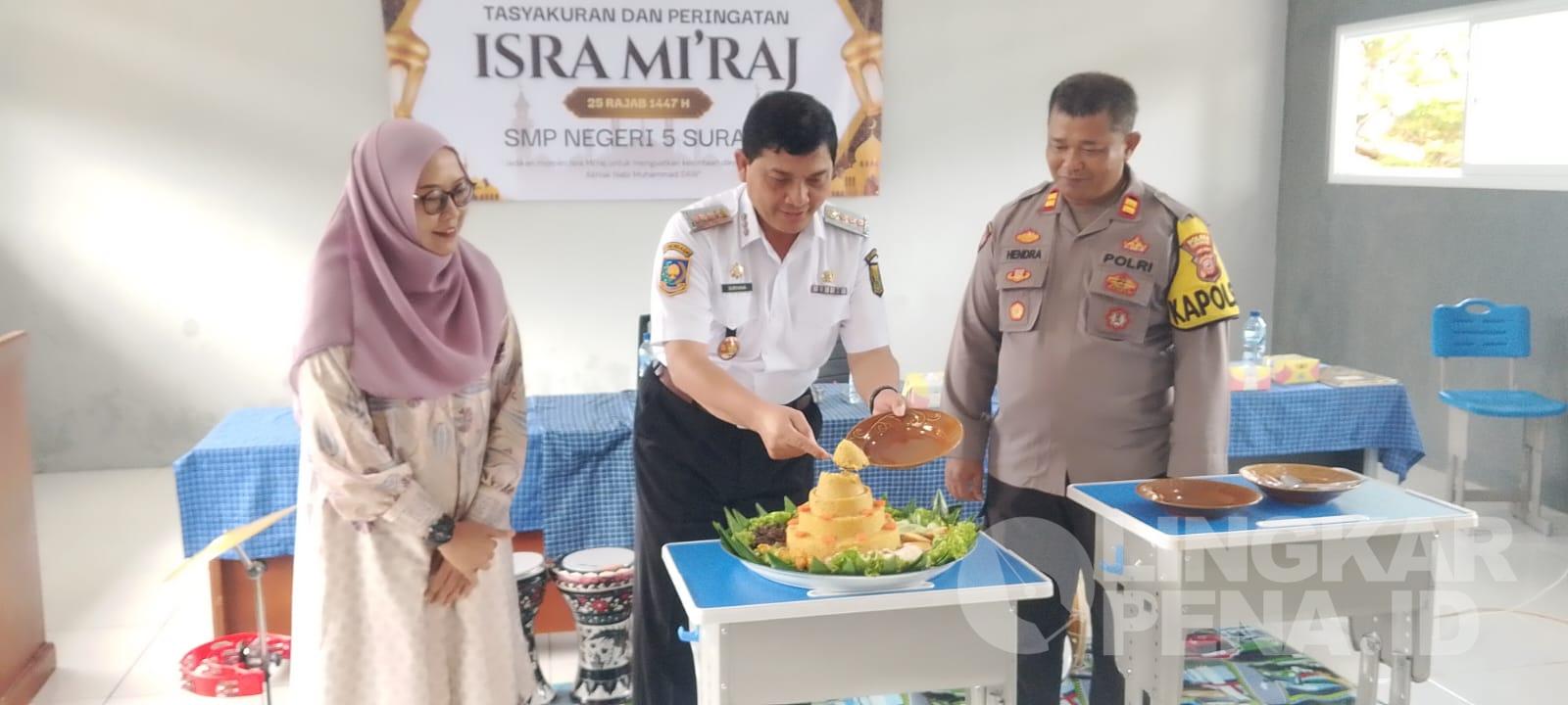 LINGKARPENA.ID | Mensyukuri karunia Allah SWT atas nikmat dan anugerah-Nya, keluarga besar SMP Negeri 5 Surade, Kabupaten Sukabumi, menggelar peringatan Isra Mi’raj Nabi Muhammad SAW yang dirangkai dengan tasyakur bi’nimat atas selesainya pembangunan gedung baru hasil program revitalisasi. Kegiatan tersebut berlangsung pada Rabu (14/1/2026).