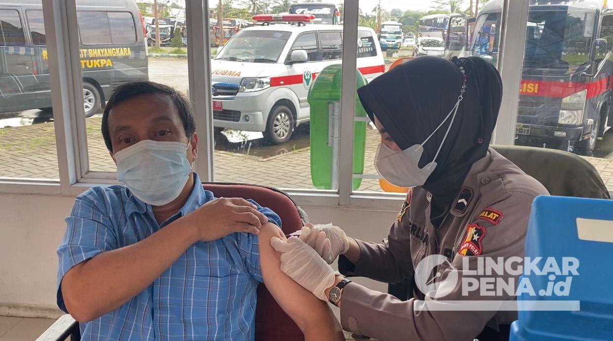 LINGKARPENA.ID – Polres Sukabumi Kota gelar gerai vaksin presisi di kawasan Terminal Type A Jalur Lingkar Selatan, Kelurahan Sudajaya Hilir, Kecamatan Baros, Kota Sukabumi pada Jumat (17/12/2021).