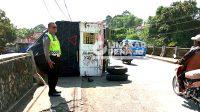Akibat Roda AS Patah, Mobil Truck Terbalik di Jembatan Cipeundeuy Perbatasan Kota-Kabupaten Sukabumi