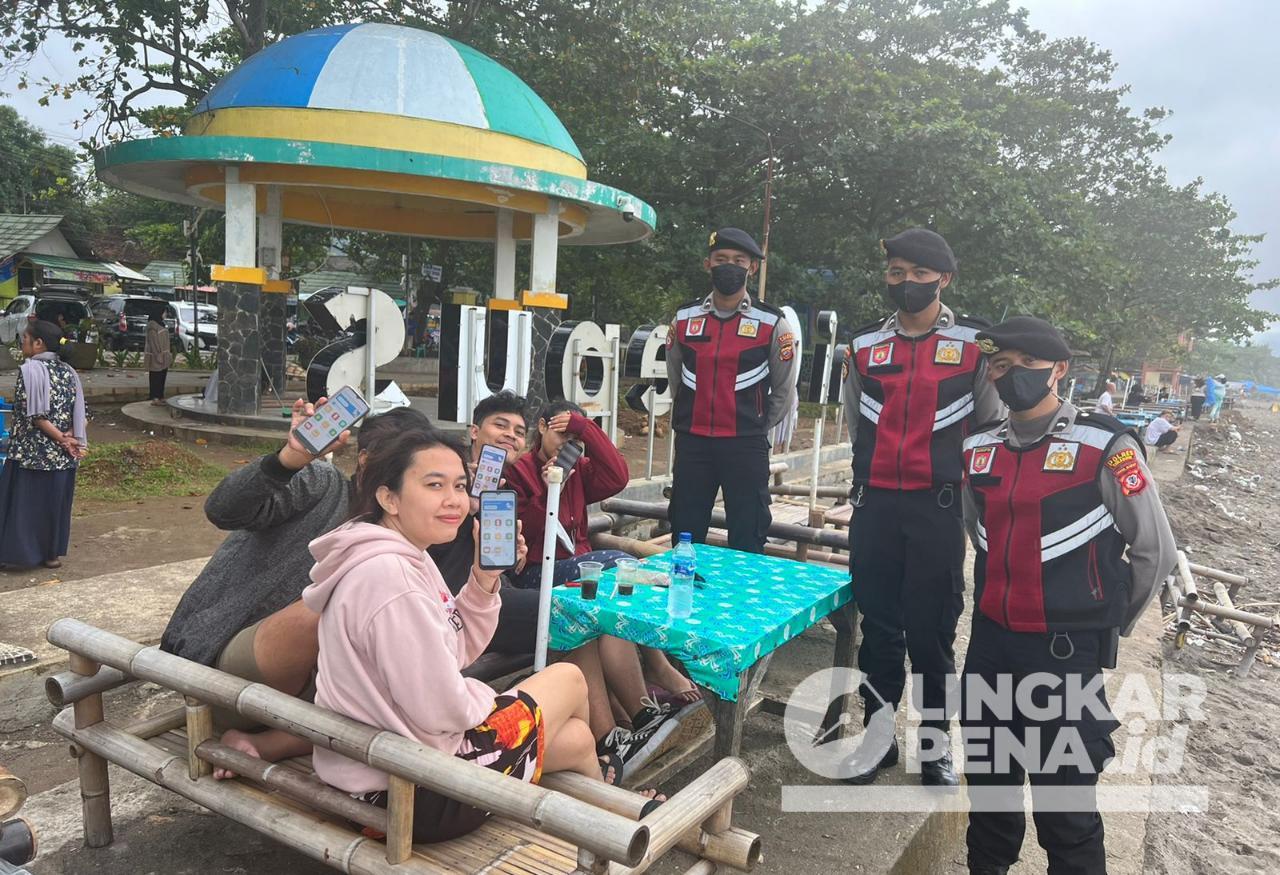 Petugas kepolisian dari Tim Black Marlin Polrs Sukabumi saat menyambangi para wisatawan Papajar, Minggu 27 Maret 2022.| Foto: Istimewa