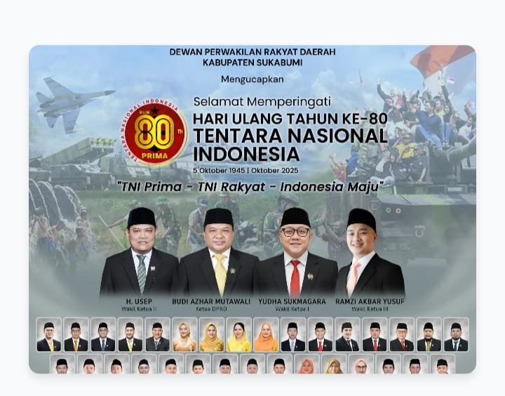 LINGKARPENA.ID | Dalam semangat kebersamaan dan penghargaan yang mendalam, seluruh keluarga besar Dewan Perwakilan Rakyat Daerah (DPRD) Kabupaten Sukabumi, Provinsi Jawa Barat, dengan penuh khidmat mengucapkan Selamat Hari Ulang Tahun Tentara Nasional Indonesia (TNI) ke-80 Tahun 2025.
