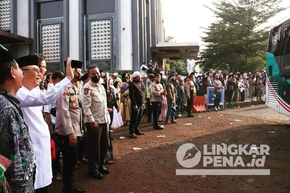 LINGKARPENA.ID – Wakil Bupati Sukabumi H. Iyos Somantri melepas jemaah calon haji (Calhaj), Sabtu, 11 Juni 2022. Pelepasan 404 ccalon haji pada kloter 12 gelombang 1 asal Kabupaten Sukabumi ini, dilakukan di Komplek Pusbangdai, Kecamatan Cikembar.